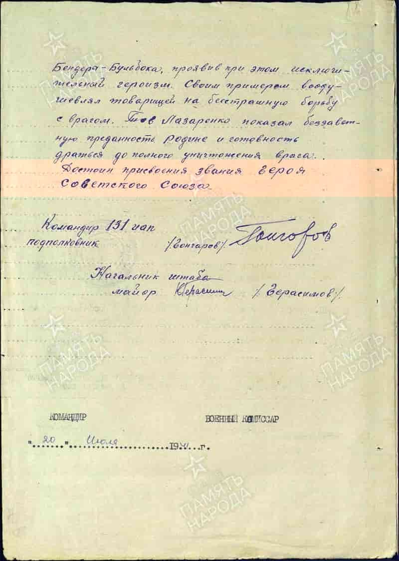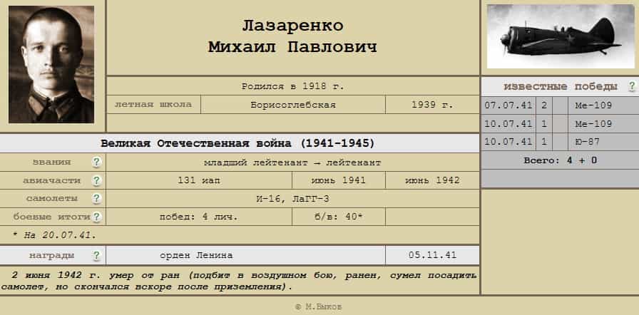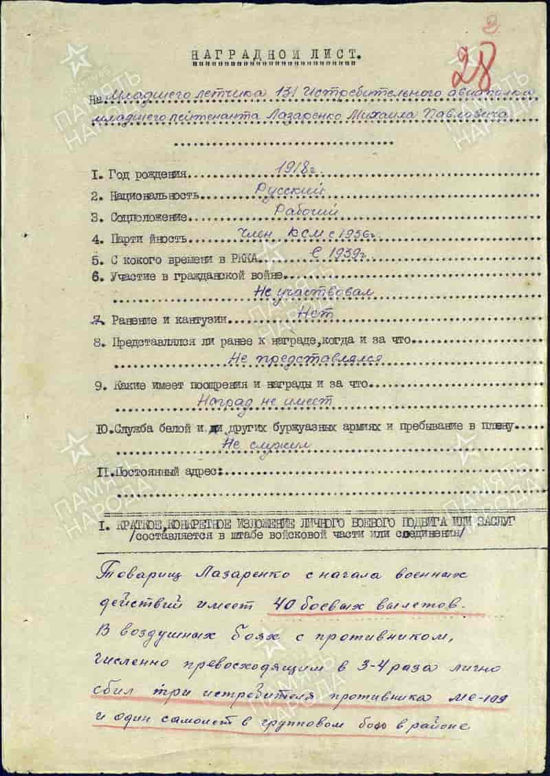 20.07.1941 младший летчик 131 иап младший лейтенант Лазаренко М.П. представлен к присвоению звания Героя Советского Союза. 05.11.1941 награждён орденом Ленина.