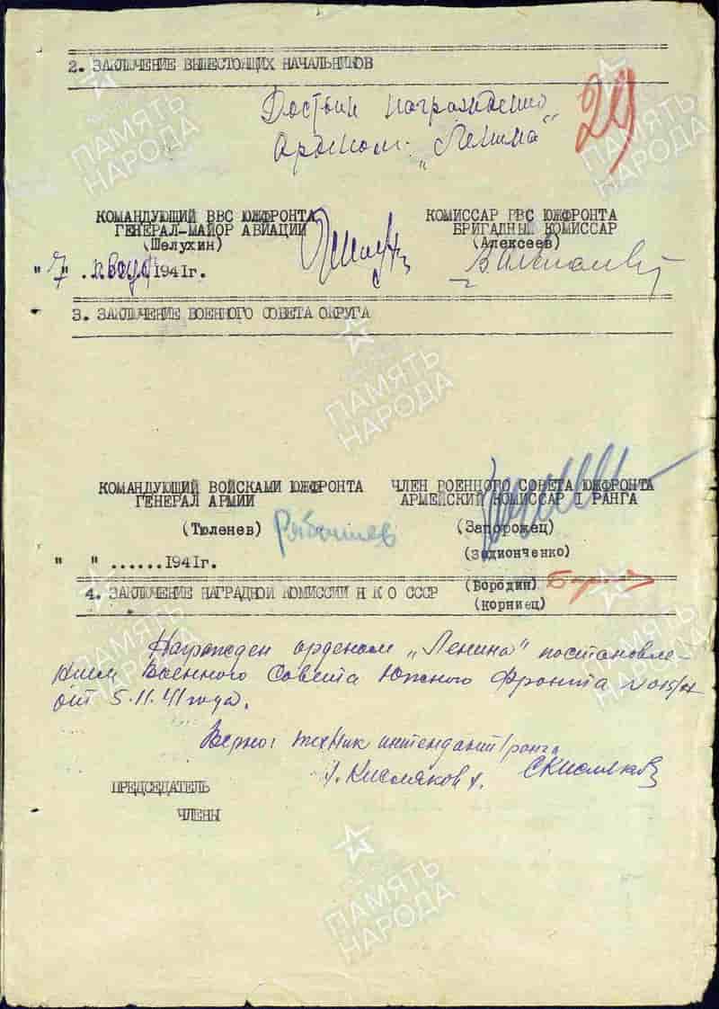 05.11.1941 Лазаренко М.П. присвоено воинское звание лейтенант.