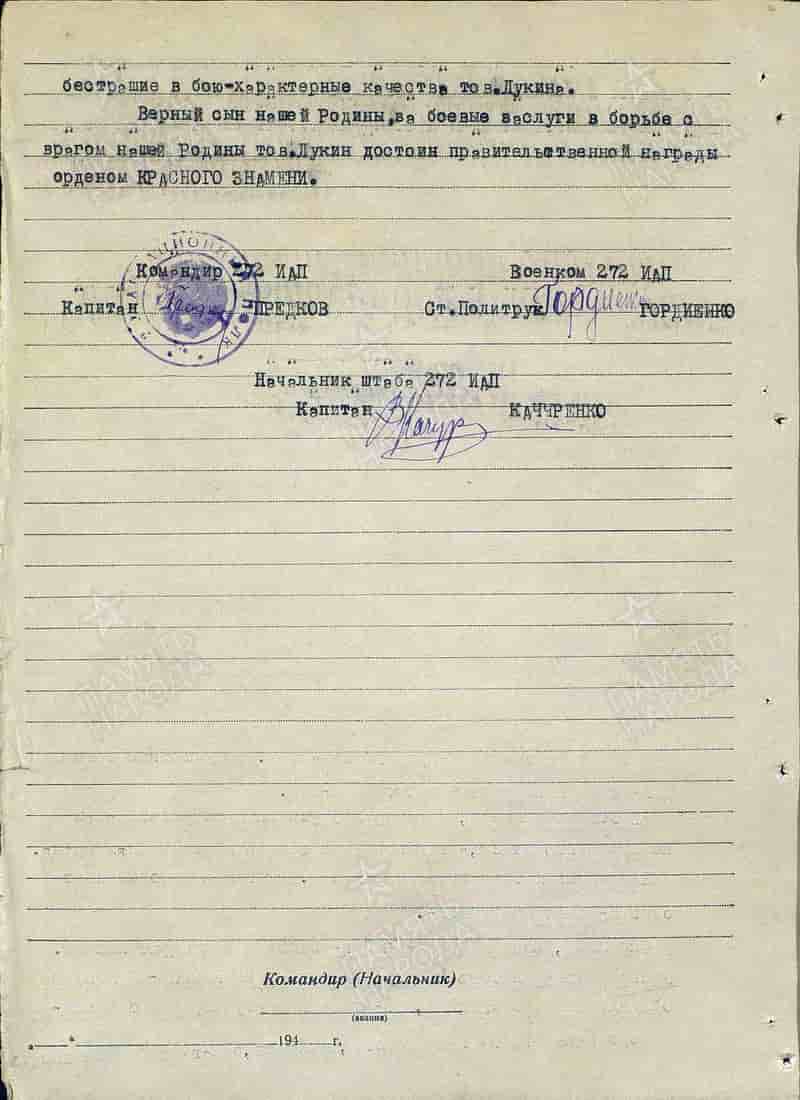 В феврале 1942 г. командир звена 272-го иап младший лейтенант Лукин П.А. представлен к награде и 16.04.1942 награждён орденом Красного Знамени.