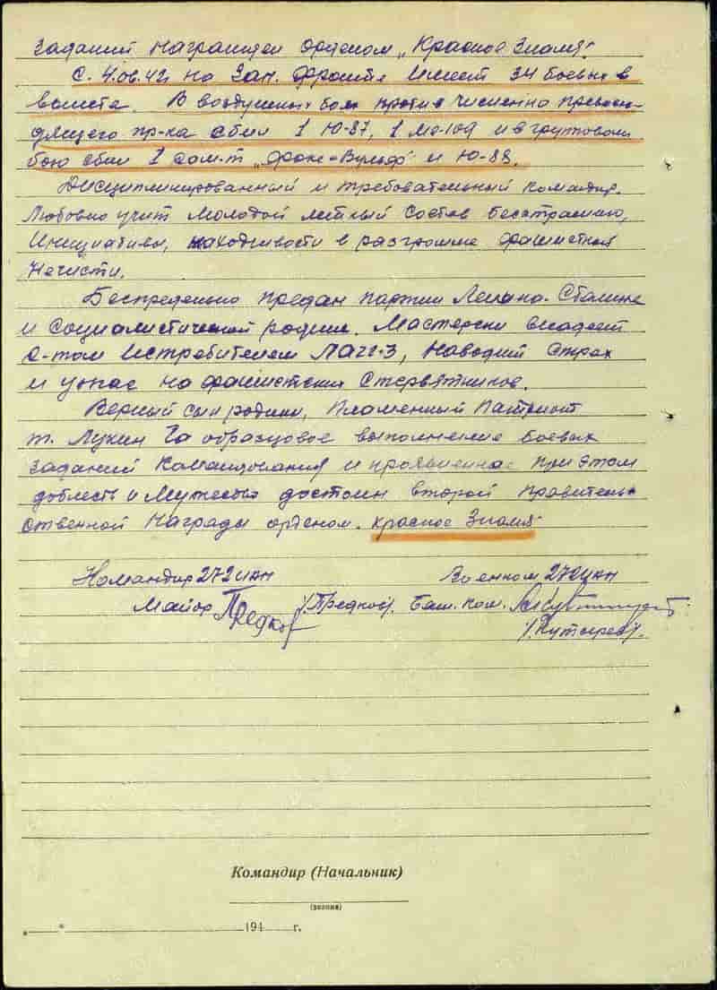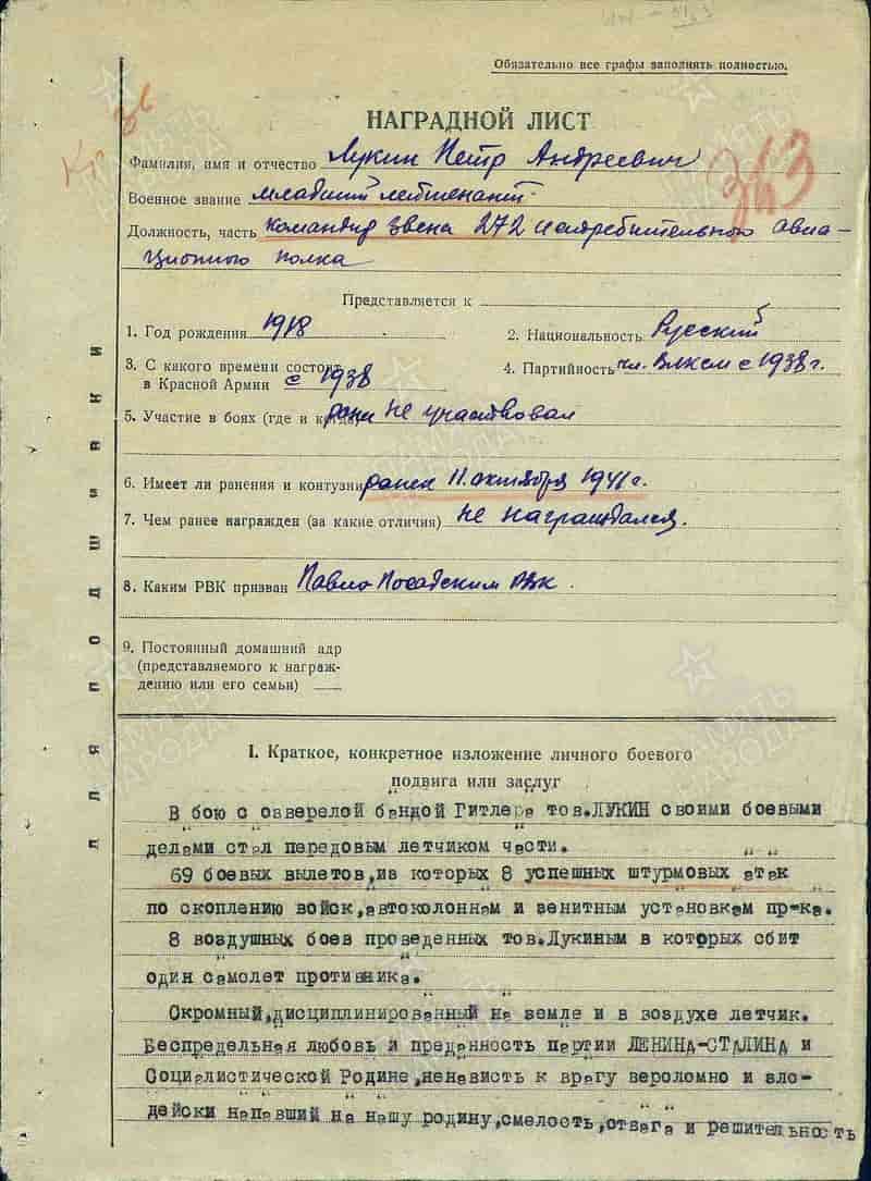 В середине июля 1942 года заместитель командира эскадрильи 272-го иап младший лейтенант Лукин П.А. представлен к награде и 23.07.1942 награждён орденом Красного Знамени.
