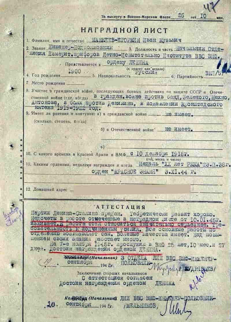 Начальник отделения измерительных приборов ЛИИ ВВС ВМФ инженер-подполковник Манкеев-Егоркин И.К. дважды представлялся к награждению орденом Ленина (14.09.1944, 19.09.1945) и 30.04.1947 награждён орденом Ленина.