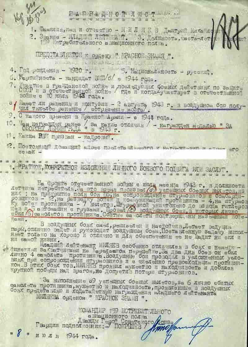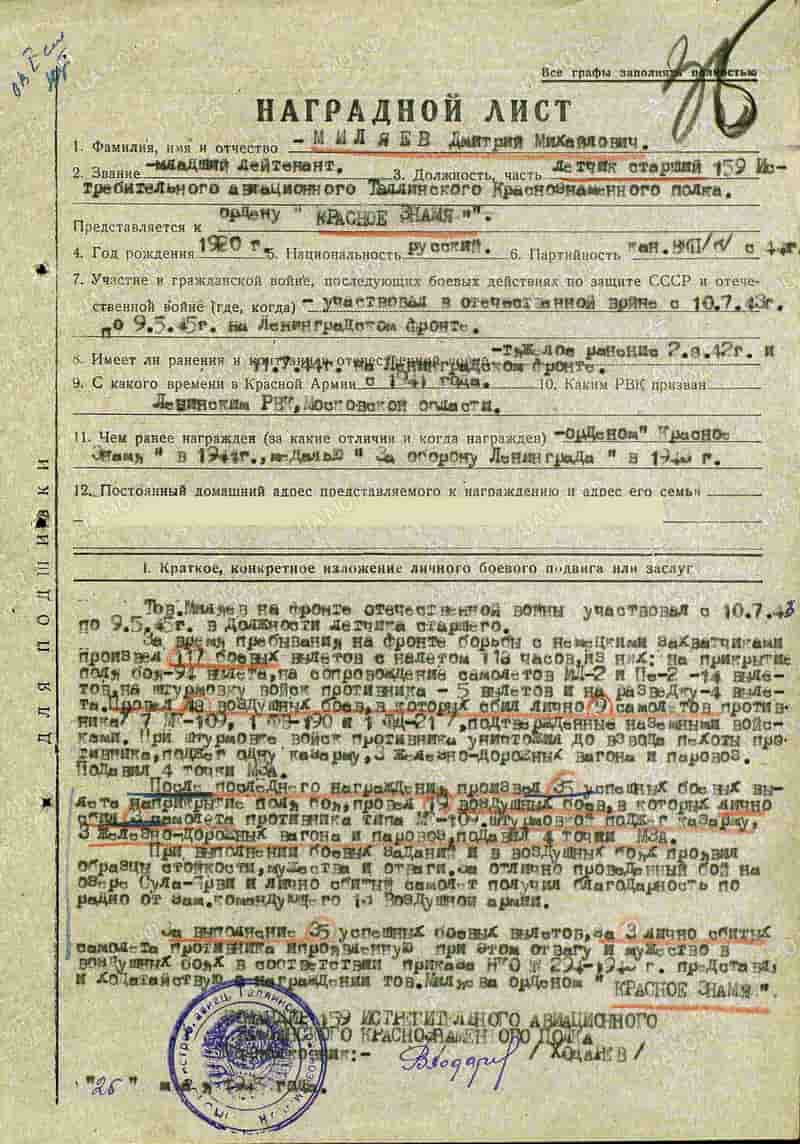 08.07.1944 лётчик старший 159 иап младший лейтенант Миляев Д.М. представлен к награде и 25.07.1944 награждён орденом Красного Знамени.