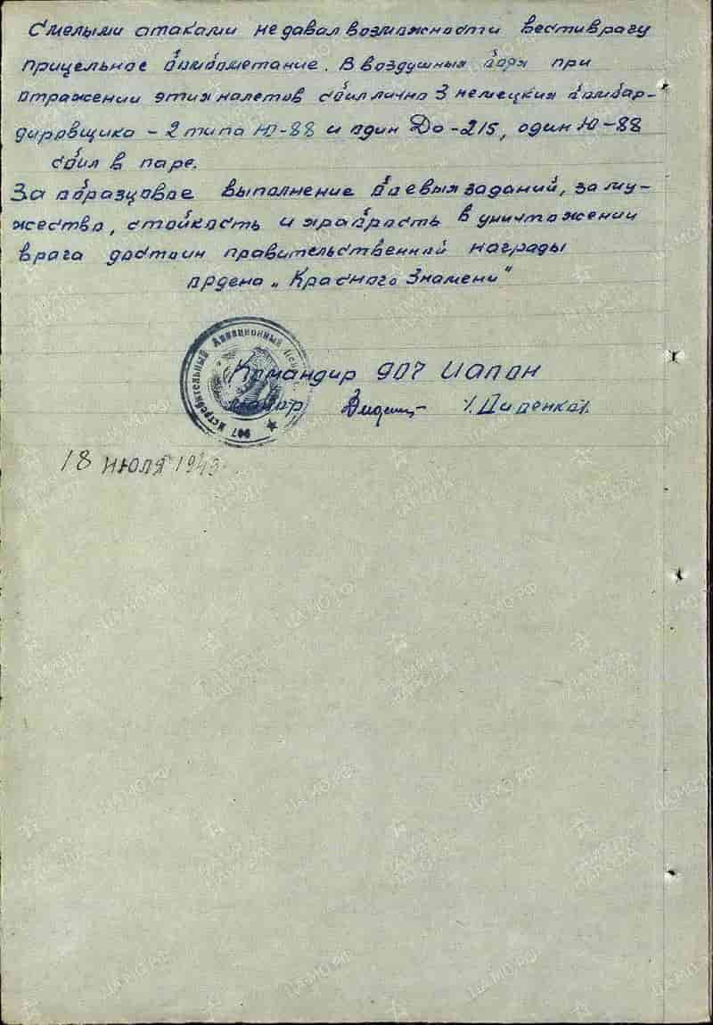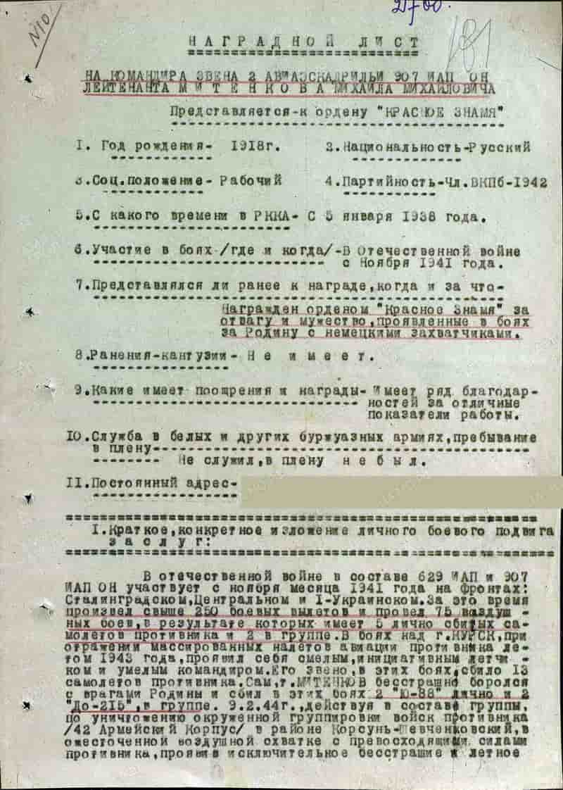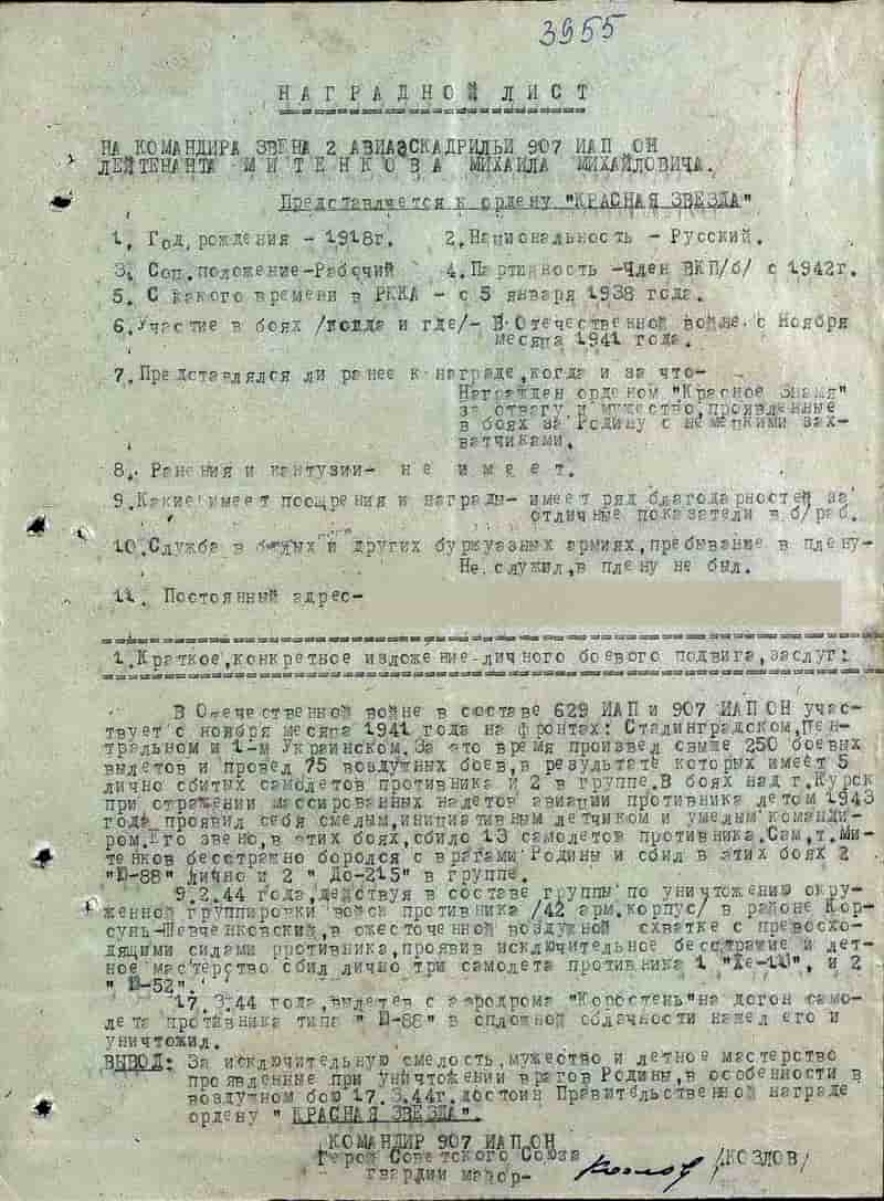 13.02.1944 командир звена 2-й эскадрильи 907 иап он 9 иак ПВО Западного фронта ПВО гвардии лейтенант Митенков М.М. представлен к награде и 19.04.1944 награждён орденом Красного Знамени.