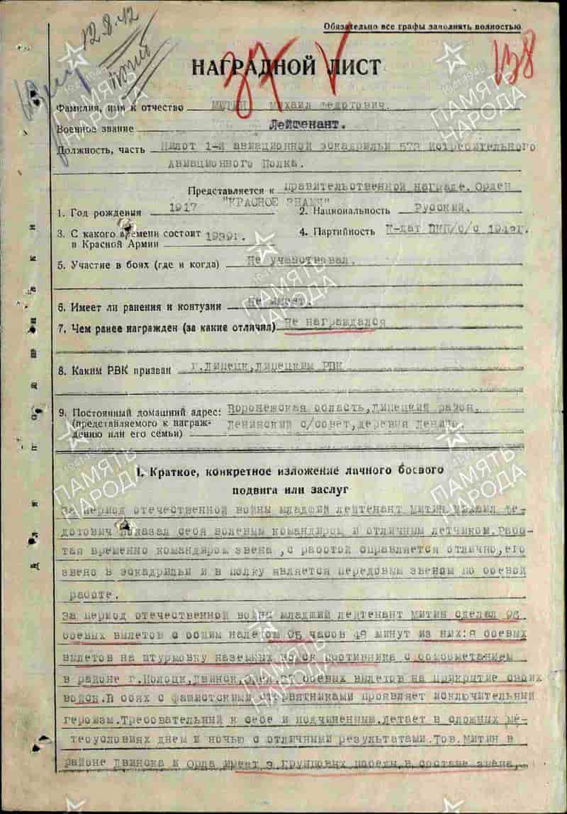 07.04.1942 пилоту отдельной эскадрильи 591 иап ПВО 36 иад ПВО Ряжско-Тамбовского дивизионного района ПВО Брянского фронта Митину Михаилу Федотовичу присвоено воинское звание лейтенант.