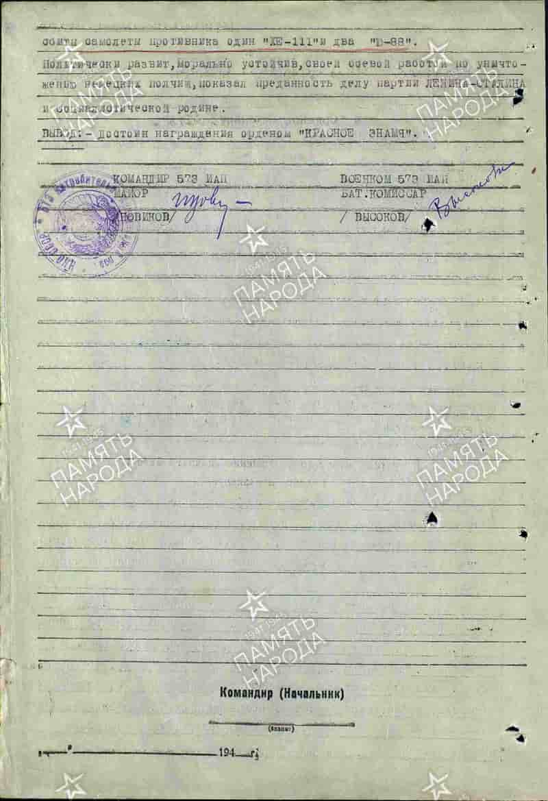 В дальнейшем служил и воевал в составе 573 иап ПВО 101 иад ПВО Воронежско-Борисоглебского дивизионного района ПВО в оперативном подчинении Юго-Западного фронта. Сведений о назначении на должности не найдено.