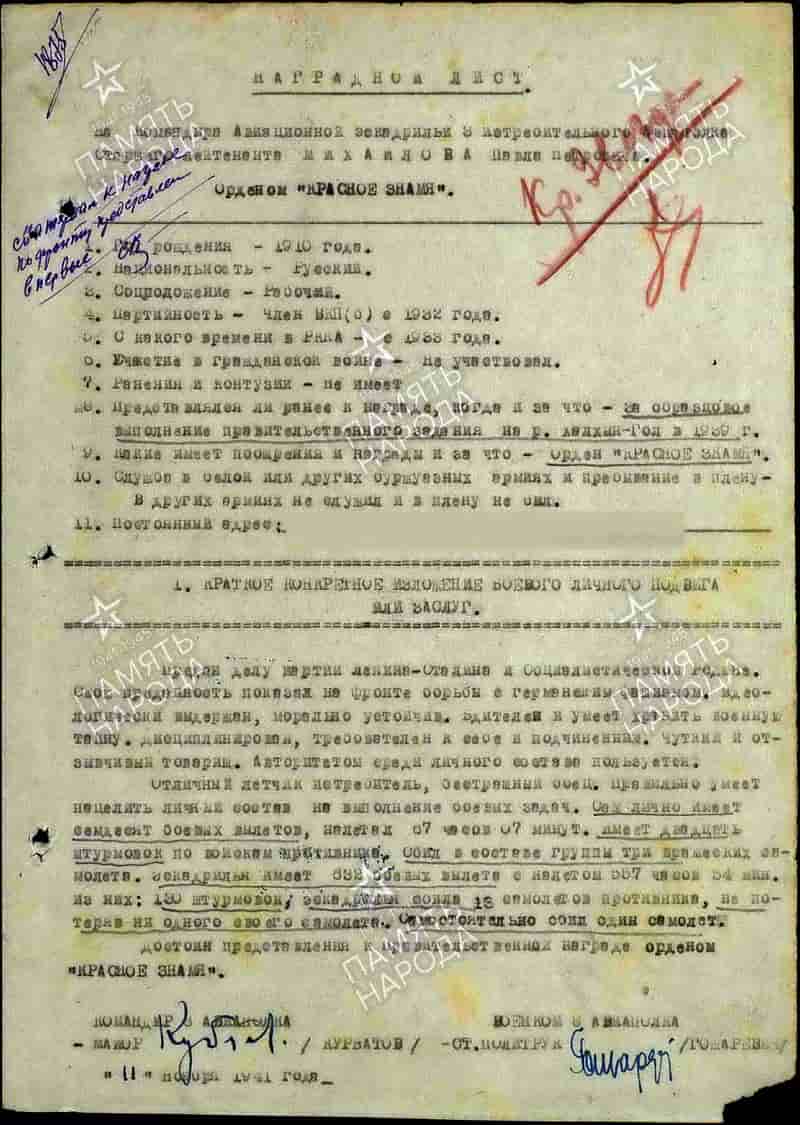 11.11.1941 командир эскадрильи 8 иап старший лейтенант Михайлов П.П. представлен к награждению орденом Красного Знамени.