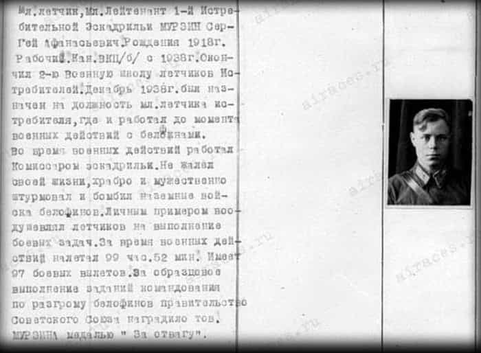«Младший лётчик, младший лейтенант 1-й истребительной эскадрильи МУРЗИН Сергей Афанасьевич. Рождения 1918 г. Рабочий. Кандидат в члены ВКП(б) с 1938 года. Окончил 2-ю военную школу лётчиков-истребителей. В декабре 1938 года был назначен на должность младшего лётчика-истребителя, где и работал до момента военных действий с белофиннами. Во время военных действий работал Комиссаром эскадрильи. Не жалел своей жизни, храбро и мужественно штурмовал и бомбил наземные войска белофиннов. Личным примером воодушевлял лётчиков на выполнение боевых задач. За время военных действий налетал 99 час. 52 мин. Имеет 97 боевых вылетов. За образцовое выполнение заданий командования по разгрому белофиннов правительство Советского Союза наградило тов. МУРЗИНА медалью «За отвагу».